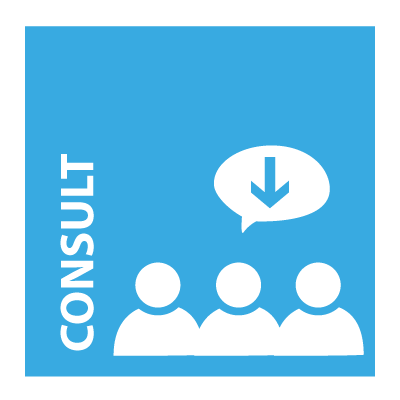 CONSULT Gather feedback on issues, alternatives or decisions. "We want to hear your thoughts and concerns. Community input will be considered along with technical, environmental, financial and regulatory considerations."